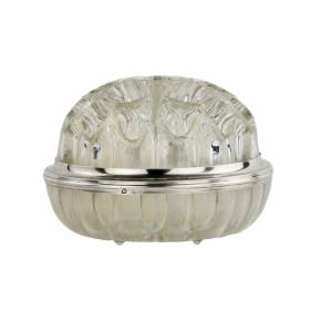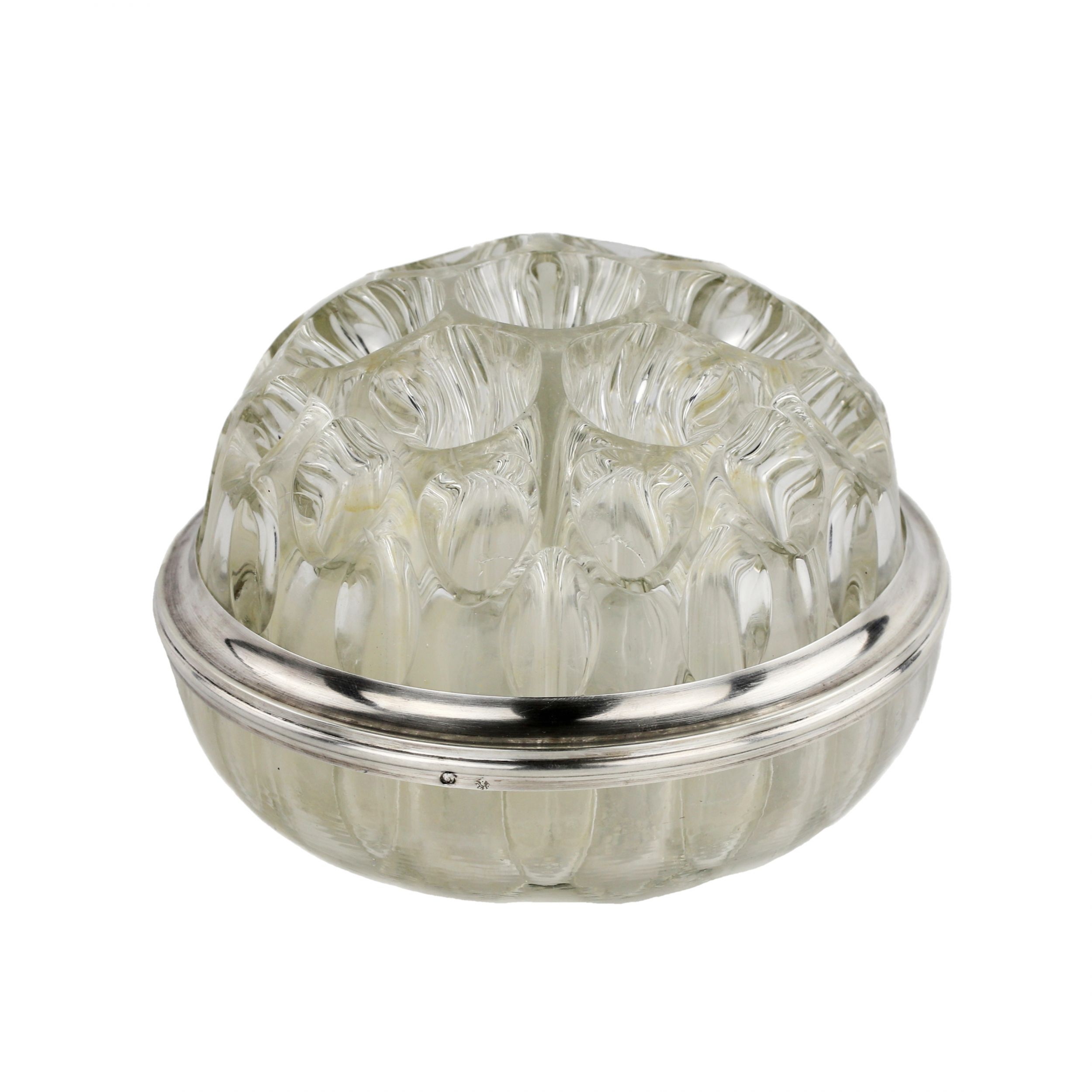 Стеклянная жардиньерка с серебренным ободом. Литая, стеклянная, шаровидная вазочка с раздельными гнездами для цветов, в серебряном ободе. На стекле Made in France. Франция 20 век. Диаметр:13 см.